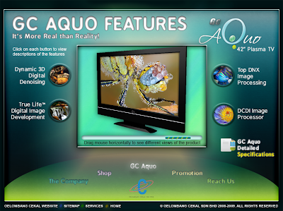users can click on each of the features to know more and see examples of the features. they can also view different angles of the GC Aquo Plasma TV by dragging their mouse from left to right on the slider.